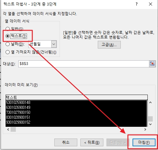 4. 열 데이터 서식 선택에서 [텍스트] 선택하고 바로 [마침]을 누른다. (위에서 말했지만 엄청난 기능이 있는 메뉴이지만 우리가 필요한 것에 열중하자)......................끝!