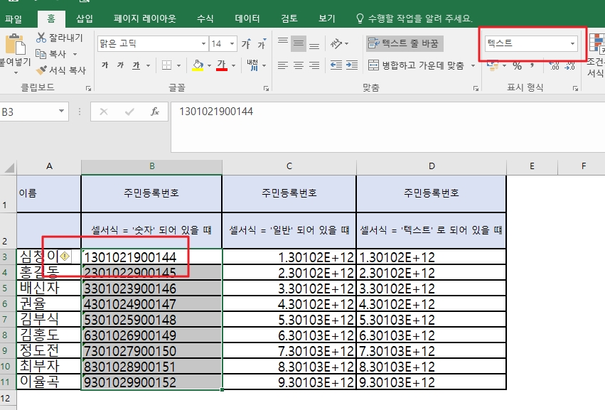 수합한 주민번호는 엑셀에 숫자로 되어 있었다. 간단히 숫자셀을 드래그하여 셀서식을 텍스트로 바꾸었다.