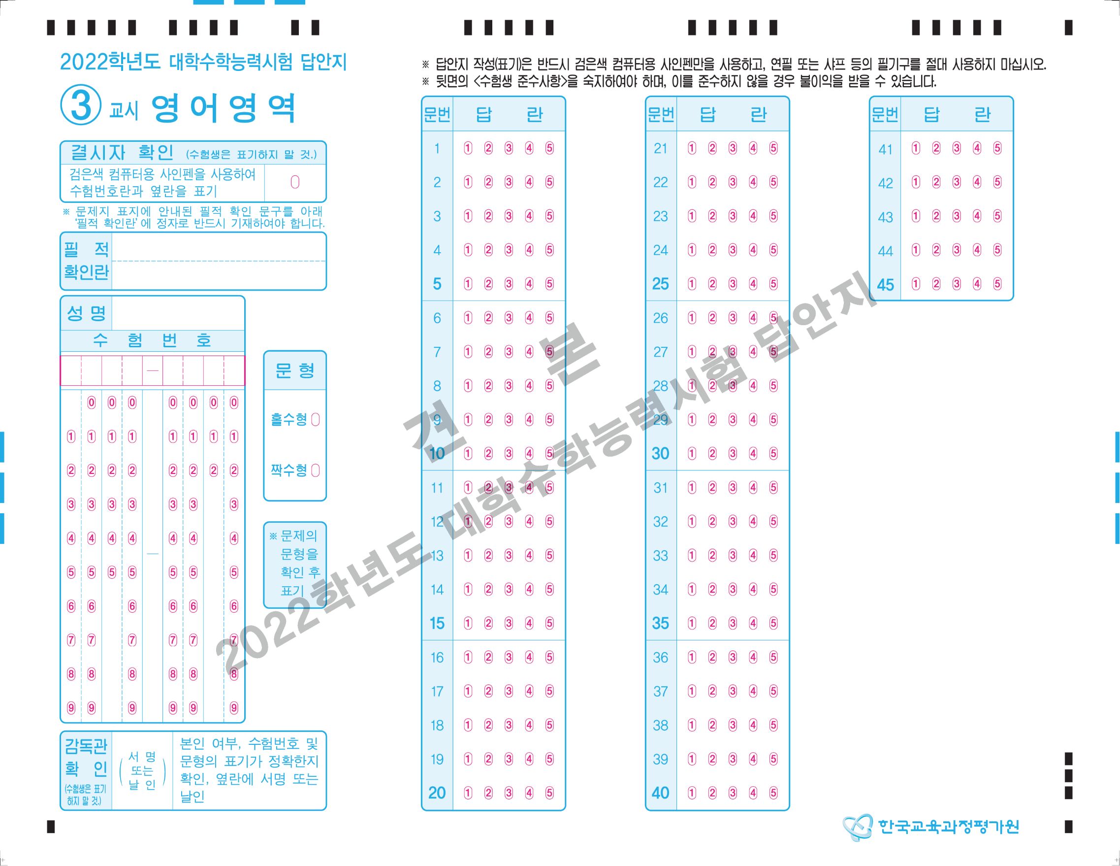 3교시 영어영역 OMR답안지 예시