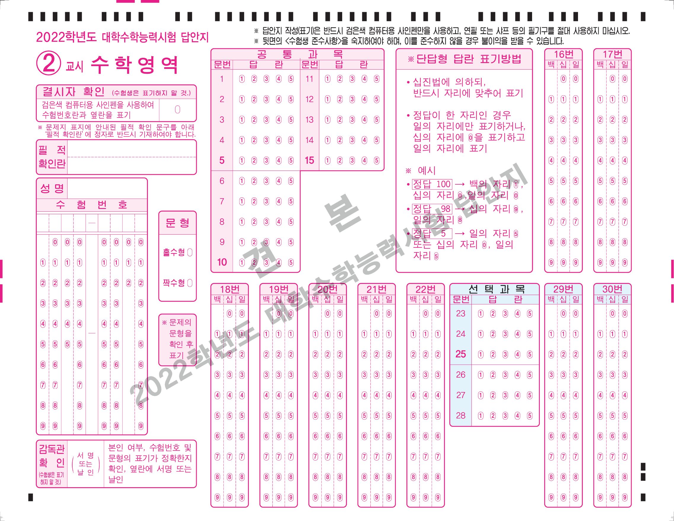 2교시 수학영역 OMR답안지 예시